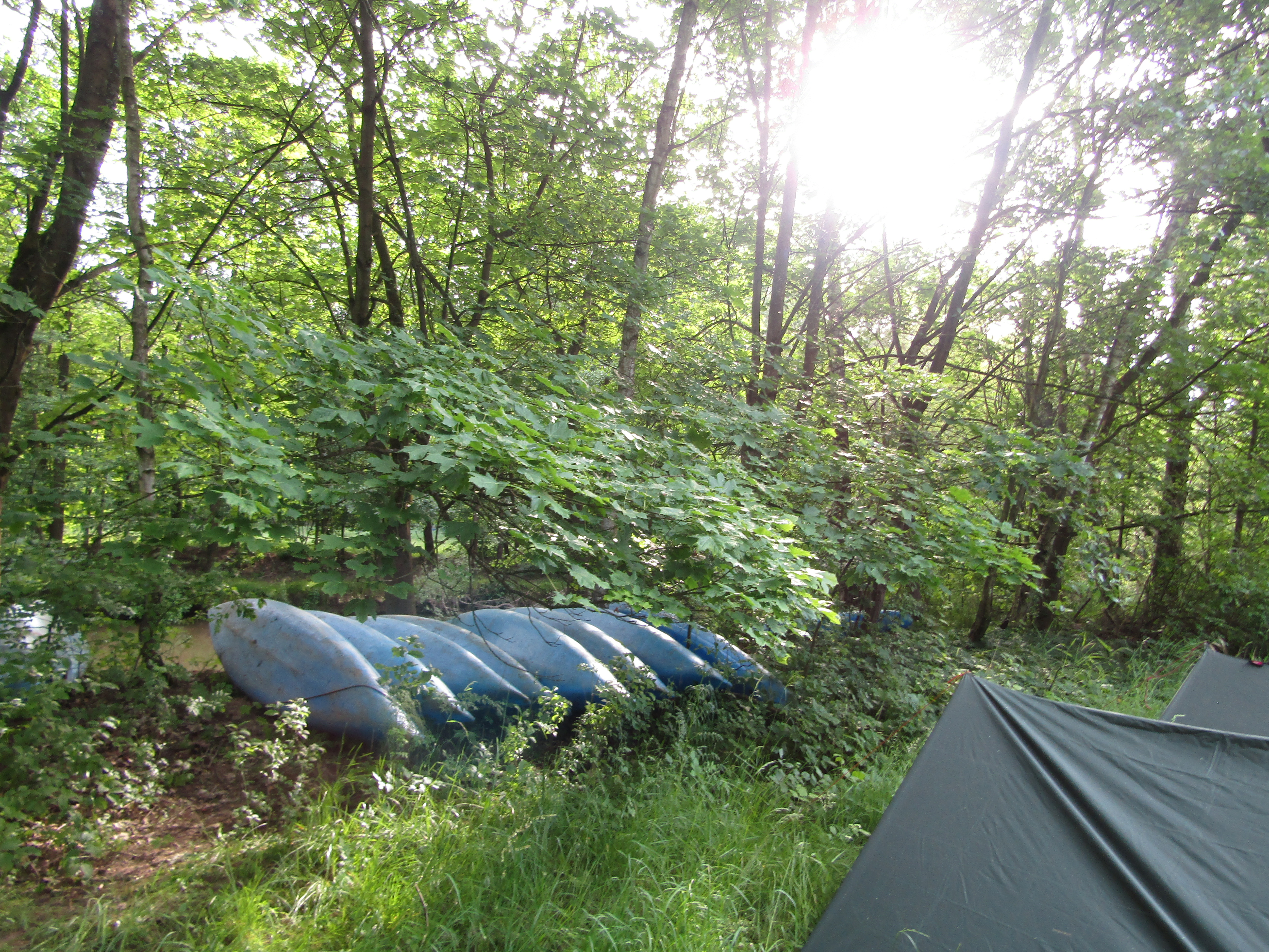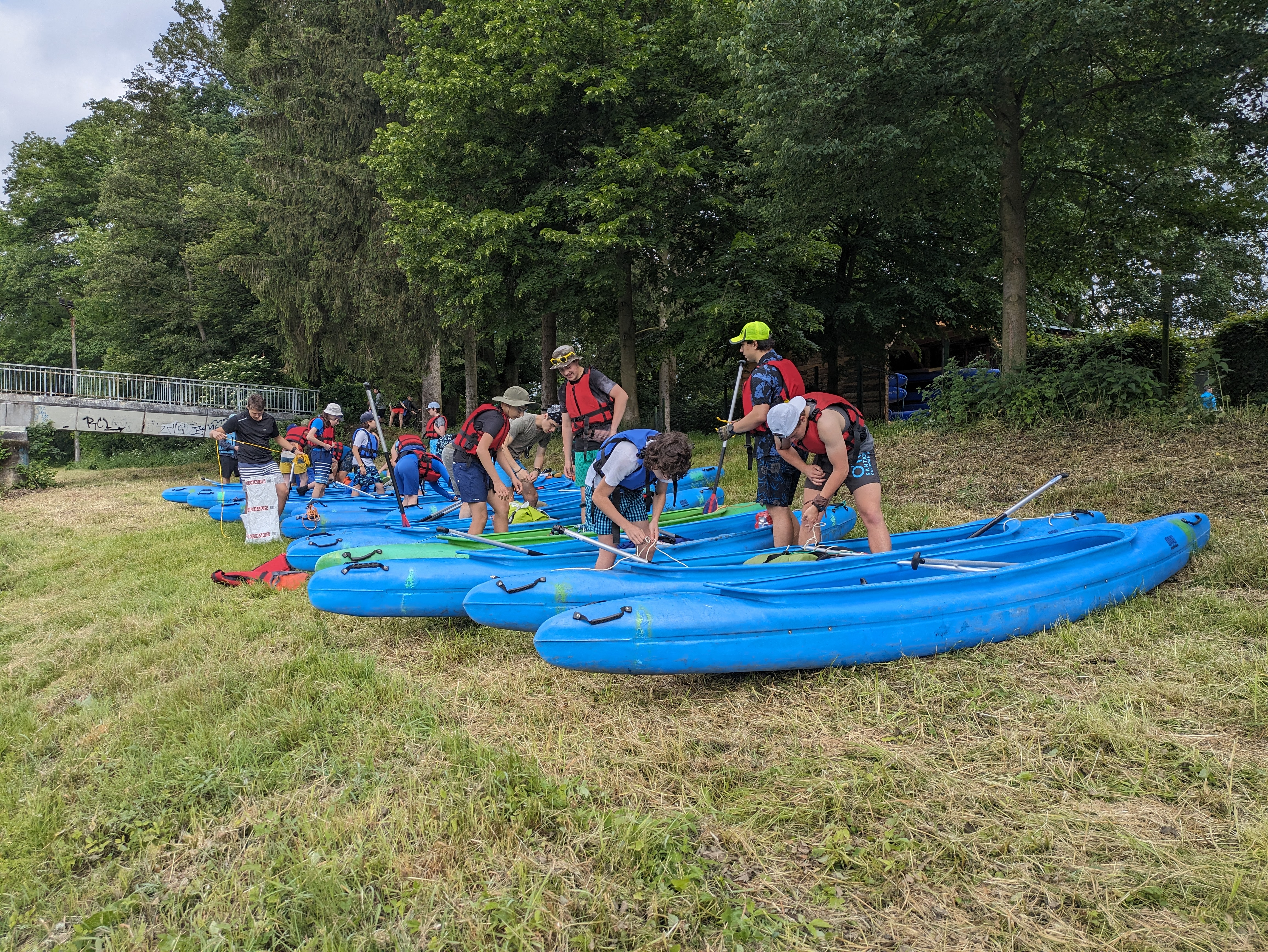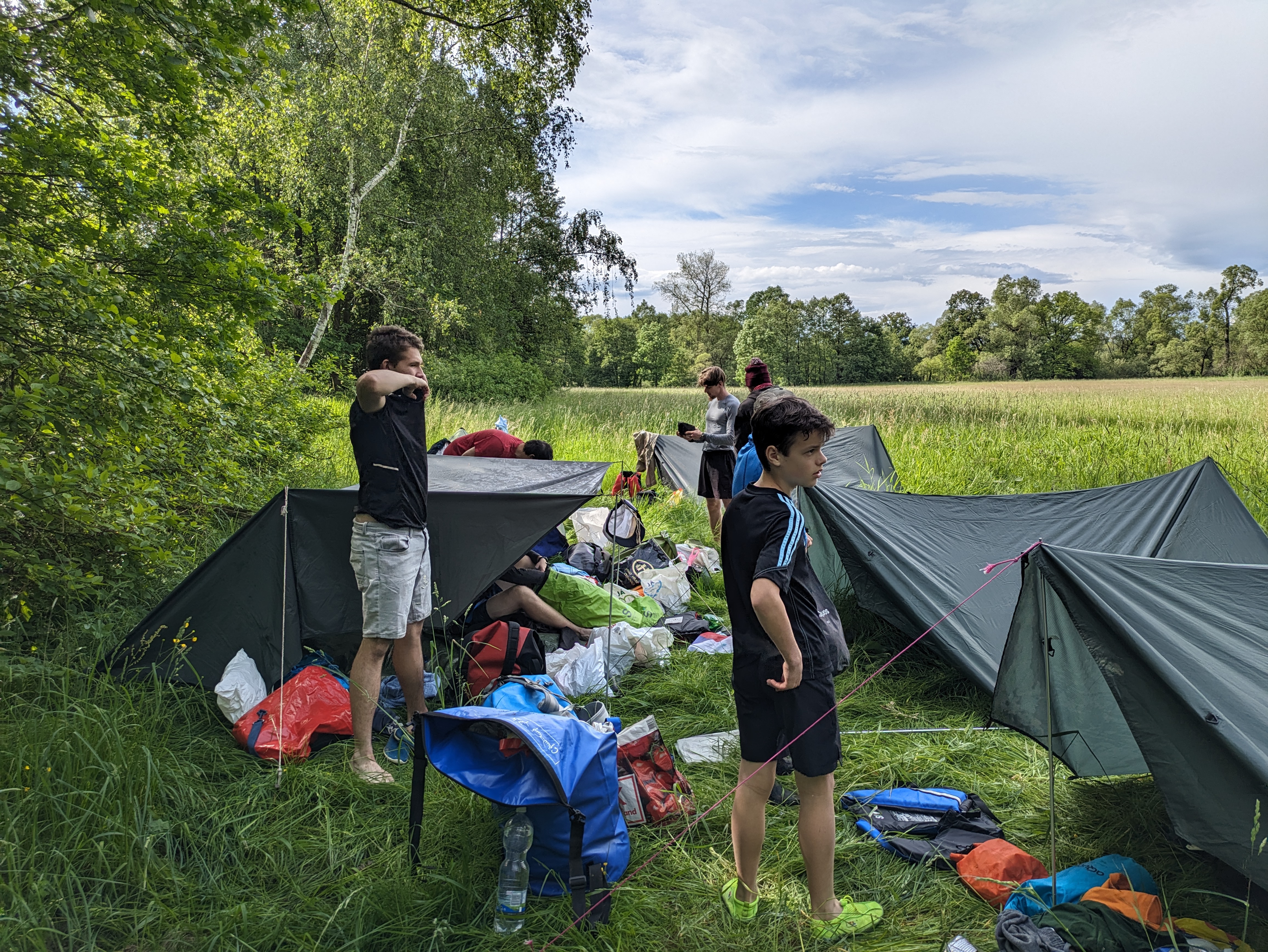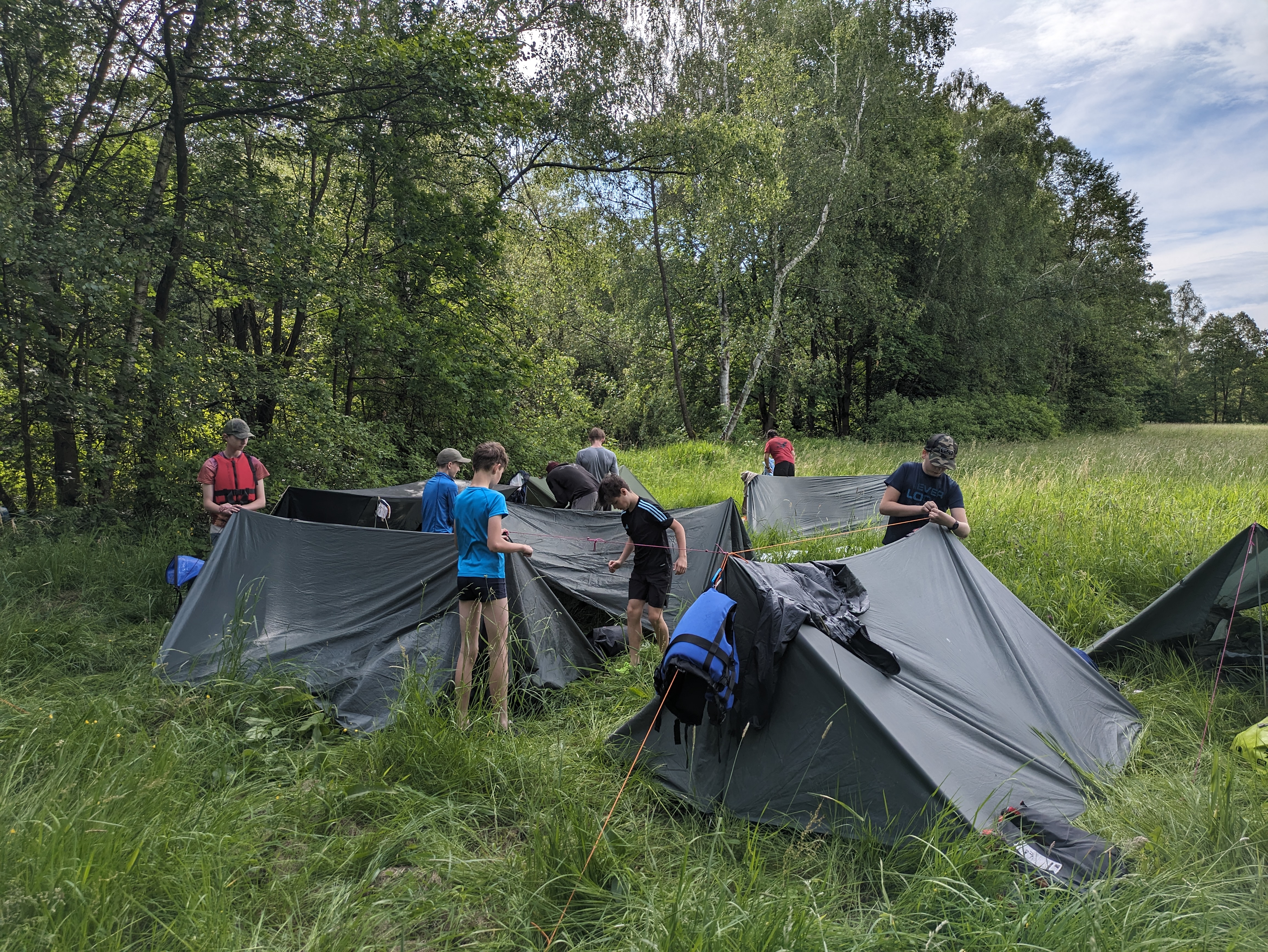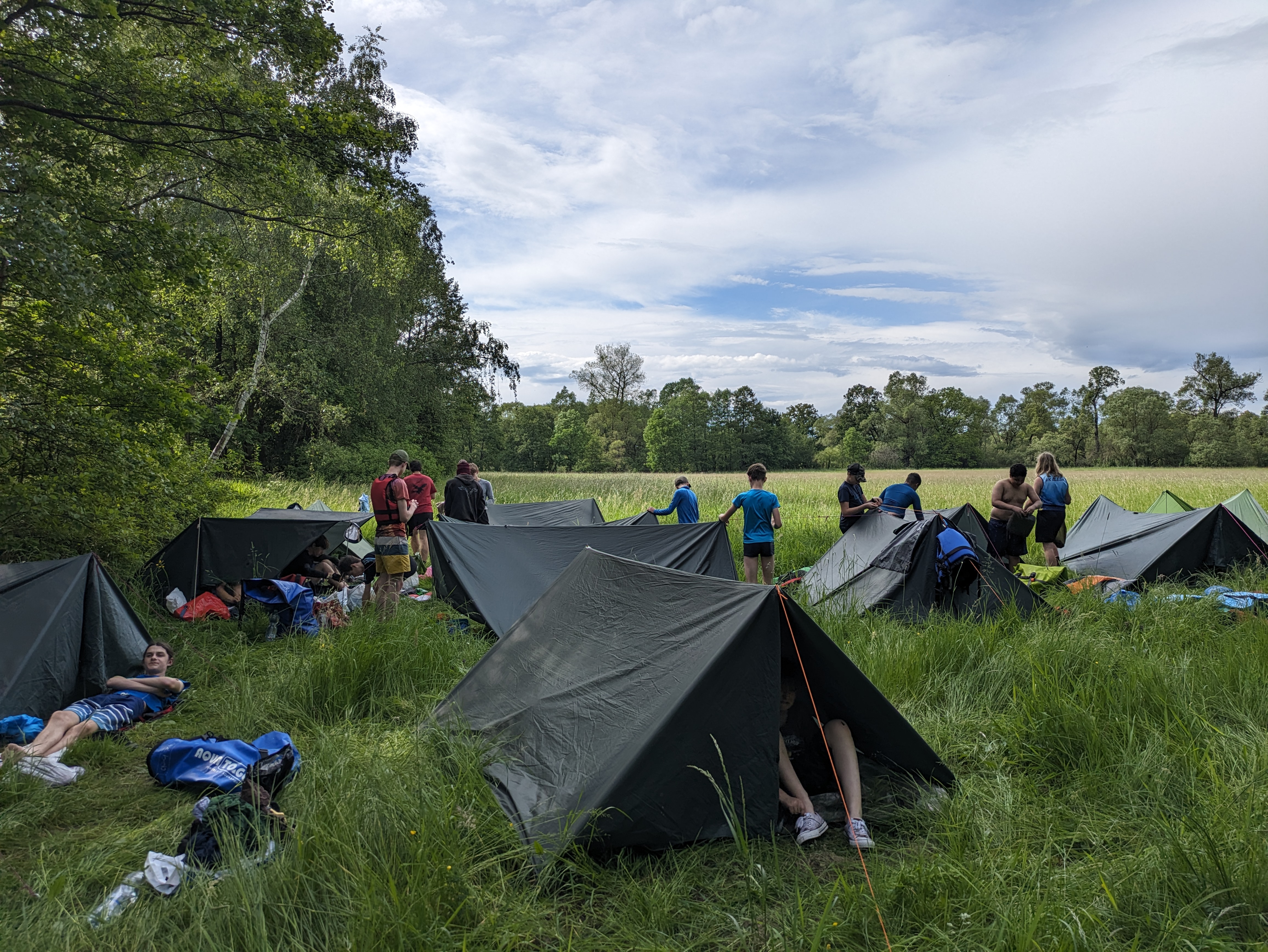 V pátek hrozila bouřka, a tak kvitujeme klidný začátek výpravy s jasnou hvězdnou oblohou. Stavbu Tarpů za deště jsme si užili na letošní Traperce. Spíme v kempu v Kostelci nad Orlicí, kde má sklad lodí i naše půjčovna. Ráno vyplouváme jako vždy v 9 hodin. I v sobotu se počasí drží, černo je na obzoru nad Hradcem Králové, ale nás všechny bouřky míjejí. Musím říct, že Orlice rozhodně nezklamala, spíš velmi příjemně překvapila. Očekávali jsme něco mezi Lužnicí ze Suchdola a Berounkou, ale vody je dost a někde teče docela rychle, navíc meandry, prudké zatáčky, vracáky a víry, občas podplouváme padlé stromy nebo z vody čouhají zrádné větve. Poměrně dost posádek se nedobrovolně koupalo, některé i vícekrát. Po Divoké Orlici plujeme na soutok s Tichou Orlicí před Týništěm. Stavíme pod mostem v Týništi, musíme nakoupit balenou pitnou vodu, ze soboty na neděli budeme spát na divoko a o žádném zdroji pitné vody nevíme. Roveři si vyzkoušeli odvážný skok z mostu do vody.