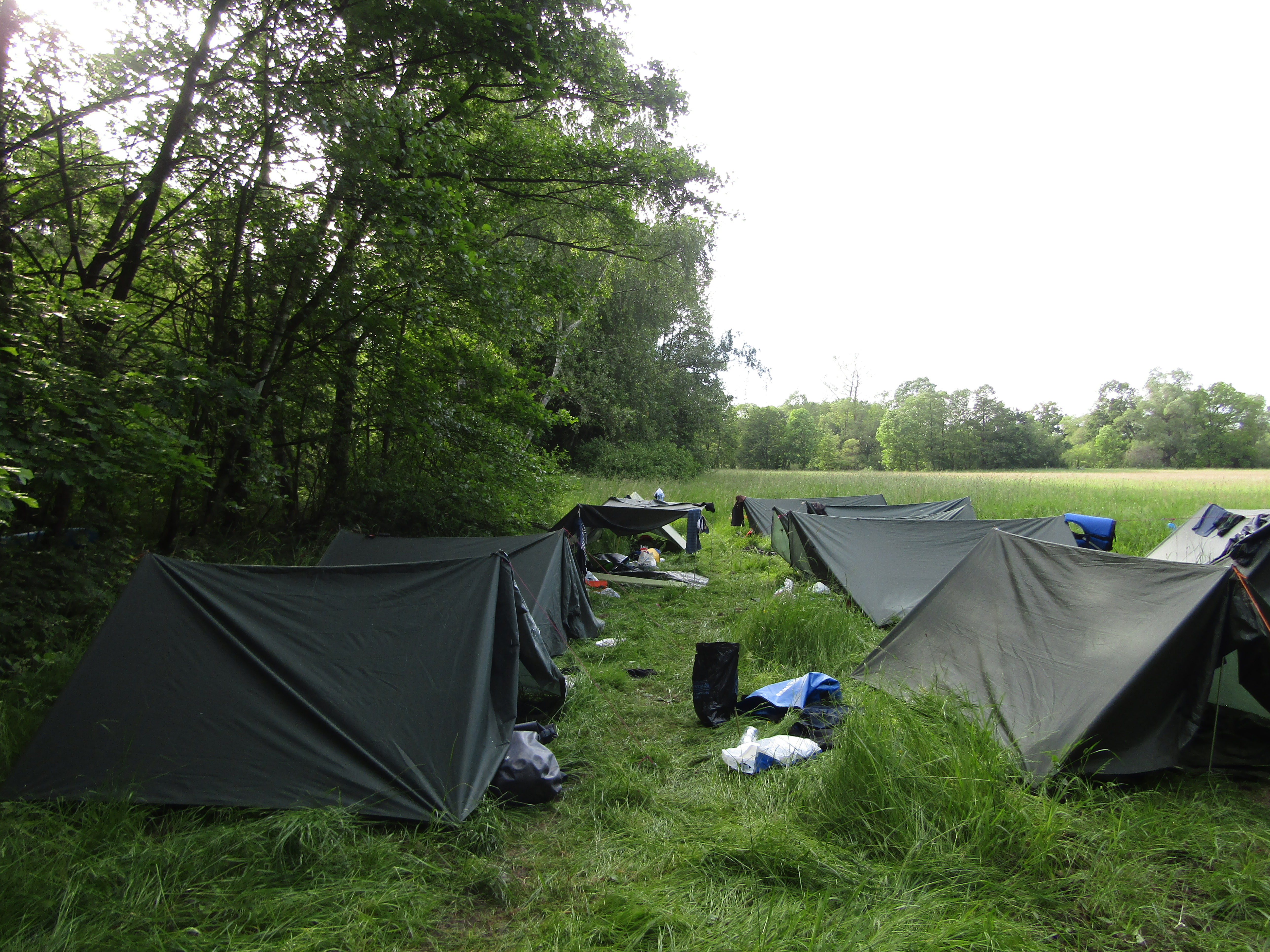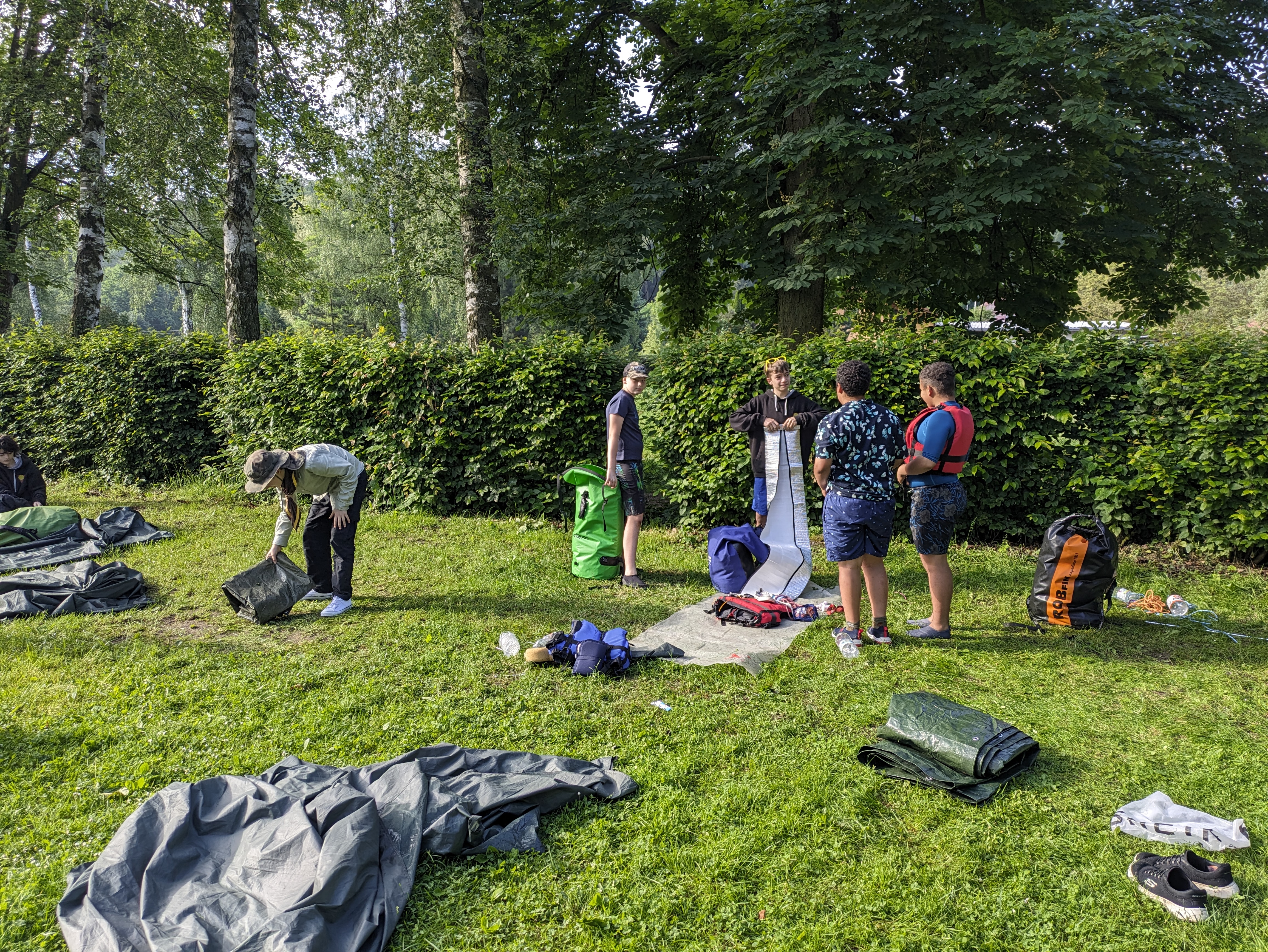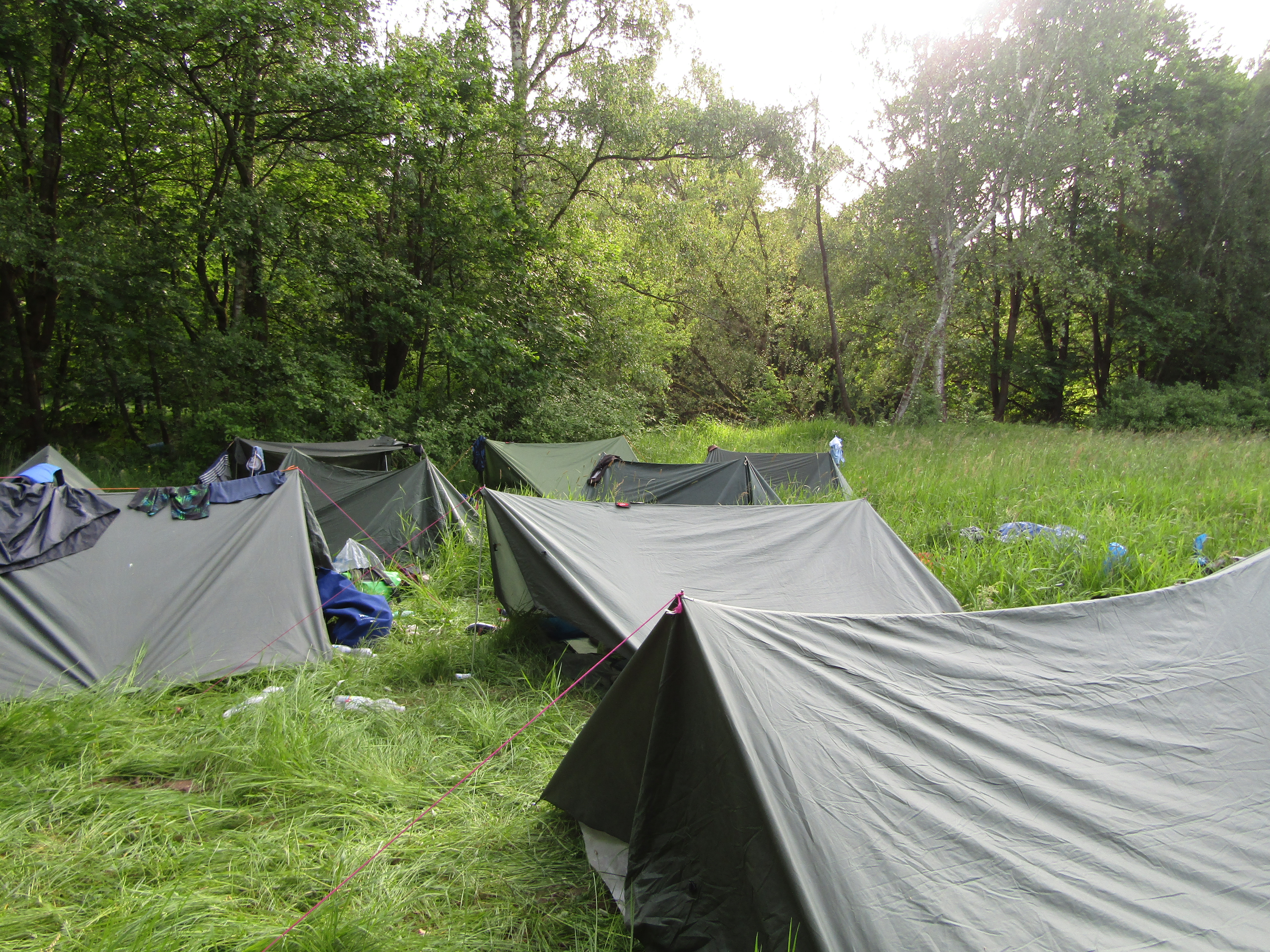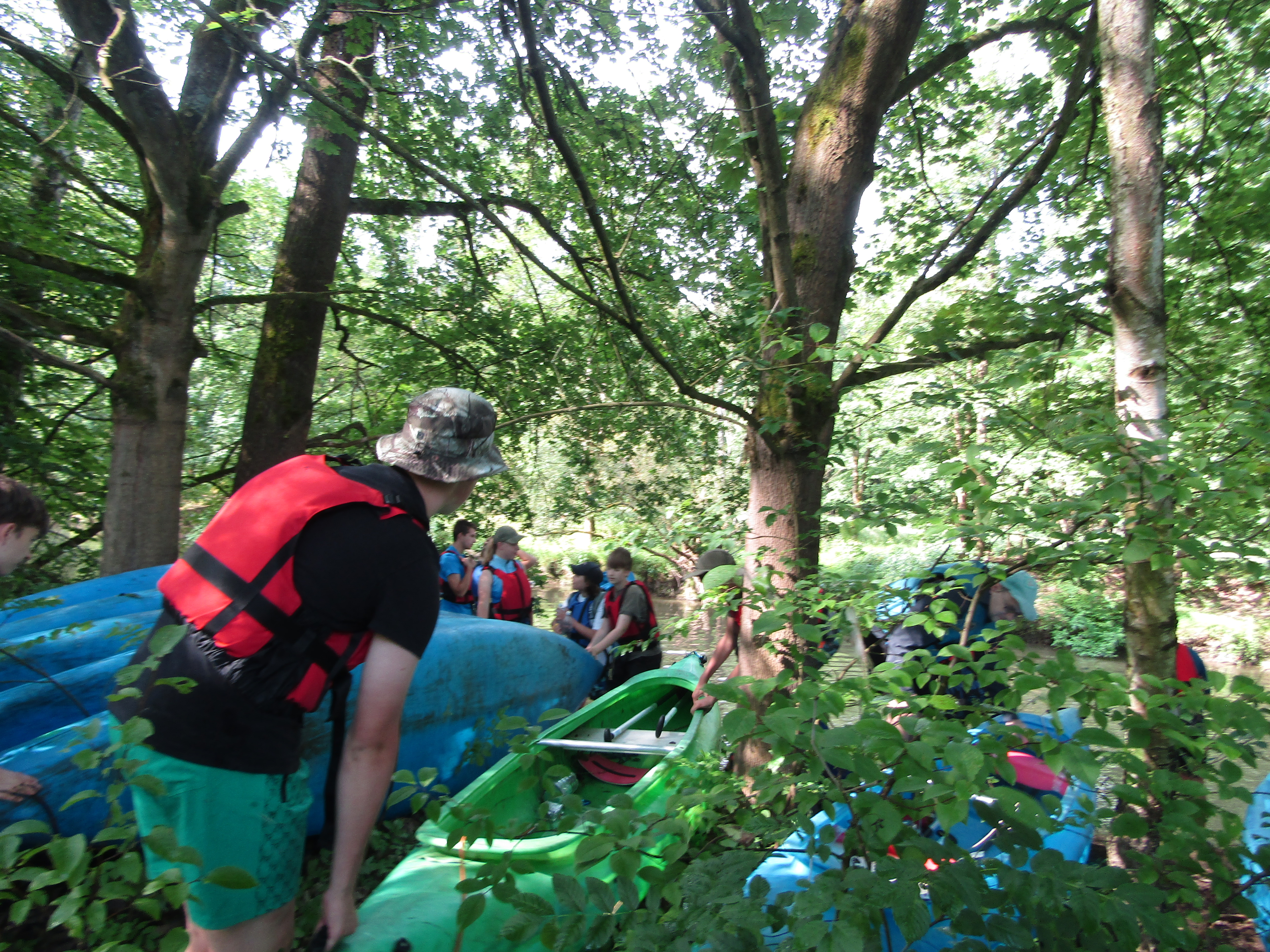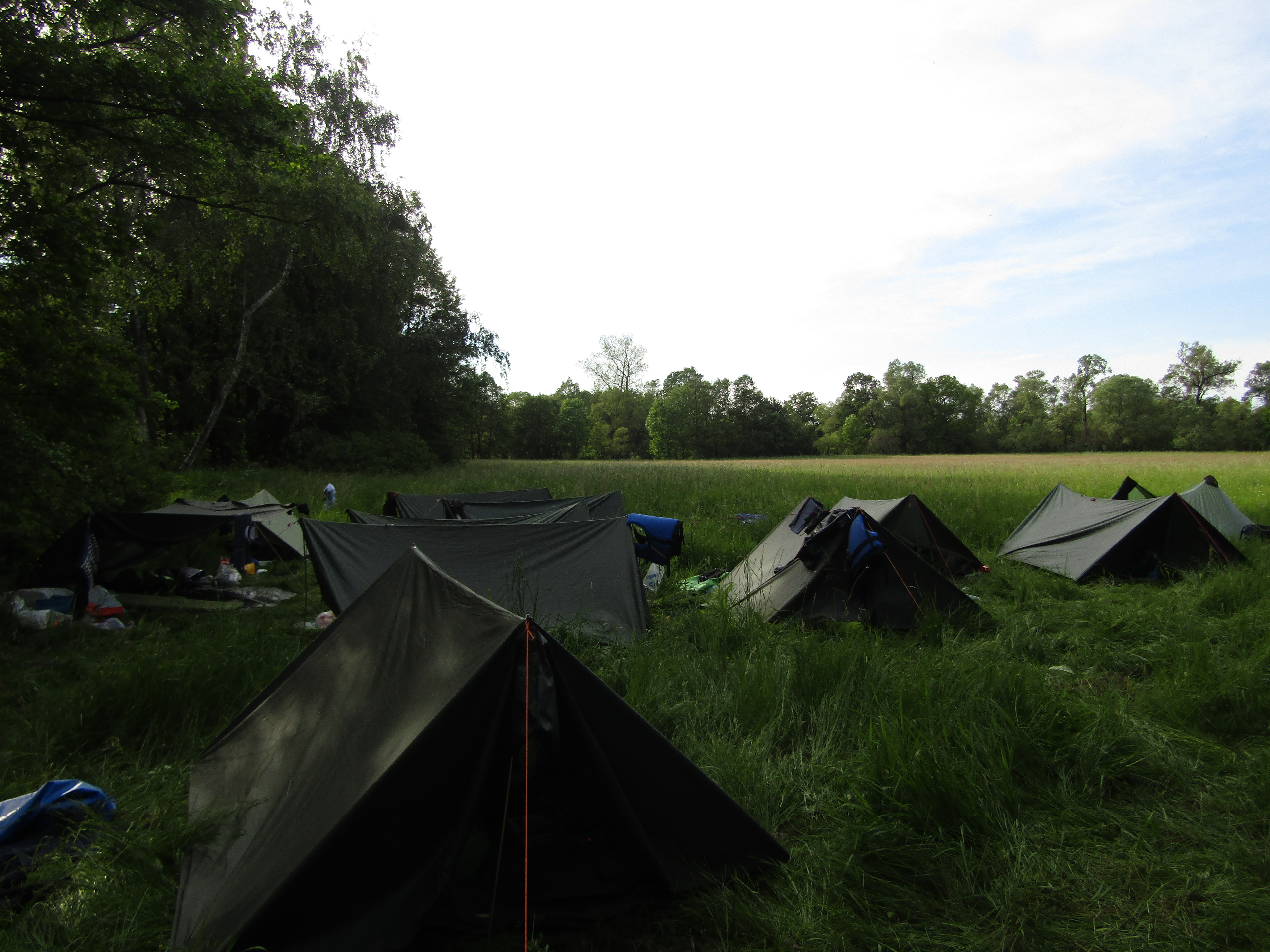 V pátek hrozila bouřka, a tak kvitujeme klidný začátek výpravy s jasnou hvězdnou oblohou. Stavbu Tarpů za deště jsme si užili na letošní Traperce. Spíme v kempu v Kostelci nad Orlicí, kde má sklad lodí i naše půjčovna. Ráno vyplouváme jako vždy v 9 hodin. I v sobotu se počasí drží, černo je na obzoru nad Hradcem Králové, ale nás všechny bouřky míjejí. Musím říct, že Orlice rozhodně nezklamala, spíš velmi příjemně překvapila. Očekávali jsme něco mezi Lužnicí ze Suchdola a Berounkou, ale vody je dost a někde teče docela rychle, navíc meandry, prudké zatáčky, vracáky a víry, občas podplouváme padlé stromy nebo z vody čouhají zrádné větve. Poměrně dost posádek se nedobrovolně koupalo, některé i vícekrát. Po Divoké Orlici plujeme na soutok s Tichou Orlicí před Týništěm. Stavíme pod mostem v Týništi, musíme nakoupit balenou pitnou vodu, ze soboty na neděli budeme spát na divoko a o žádném zdroji pitné vody nevíme. Roveři si vyzkoušeli odvážný skok z mostu do vody.