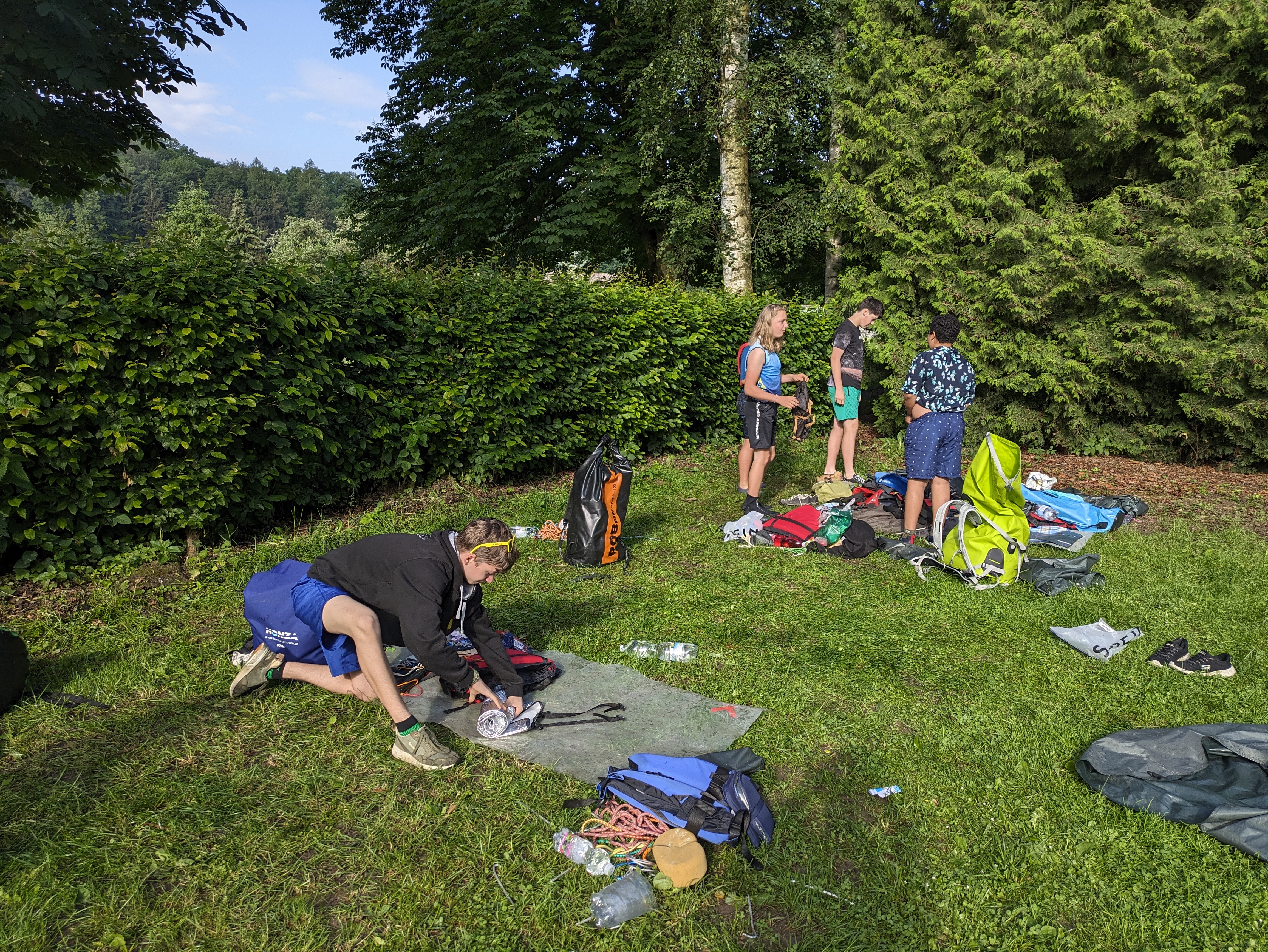 V neděli ráno balíme, uklízíme tábořiště, vyplouváme. Je tu pěkně vysoký břeh, naloďování je docela náročné stejně jako včerejší vyloďování a vodu na ulití ohniště musíme tahat vylejvačkami na provazech. Při krátké nedělní plavbě jsme si vychutnali sjezd rozvaleného jezu (vypadal dost divoce, ale nikdo se neotočil). Končíme pod mostem v Krňovicích. Myjeme lodě, koupeme se v peřejkách, slunce svítí naplno. Zbývá naložit lodě a vyrazit na vlak do Třebechovic pod Orebem.